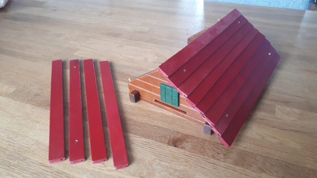- The roof system is also a bit different. Two roof panels could be anchored on wooden pins in both gables. In between, roof parts are interlocked by a simple groove system. The bottom part ends straight and the top part tapered.