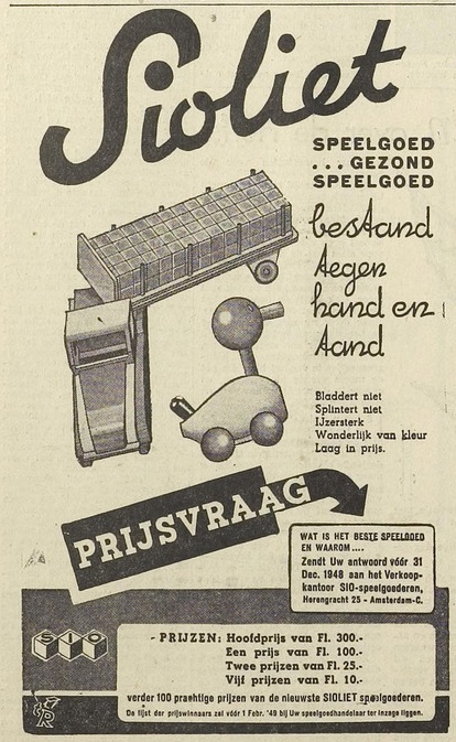 S.I.O. was a sales agent, with a head quarter in Amsterdam and at least a factory in Vroomshoop. They sold a lot of different toys, started in 1938 and went bankrupt in 1982 after a big fire.